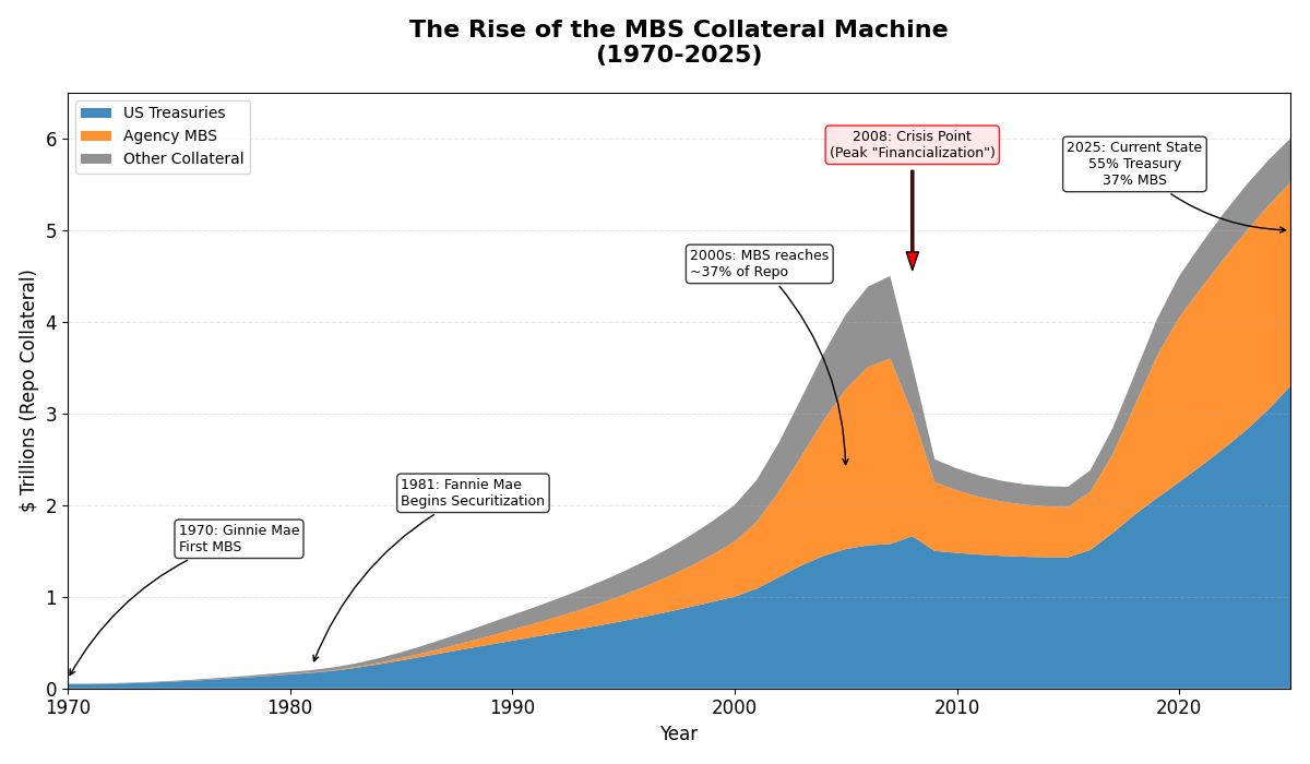 Why the difference? Treasuries are issued by the sovereign and are perceived as the ultimate safe asset. MBS, despite their government backing, still carry some credit and prepayment risk. But the key point is this: the system needed more collateral than Treasuries alone could provide. MBS filled that gap, and in doing so, turned American homeownership into a leveraged, financialized commodity.