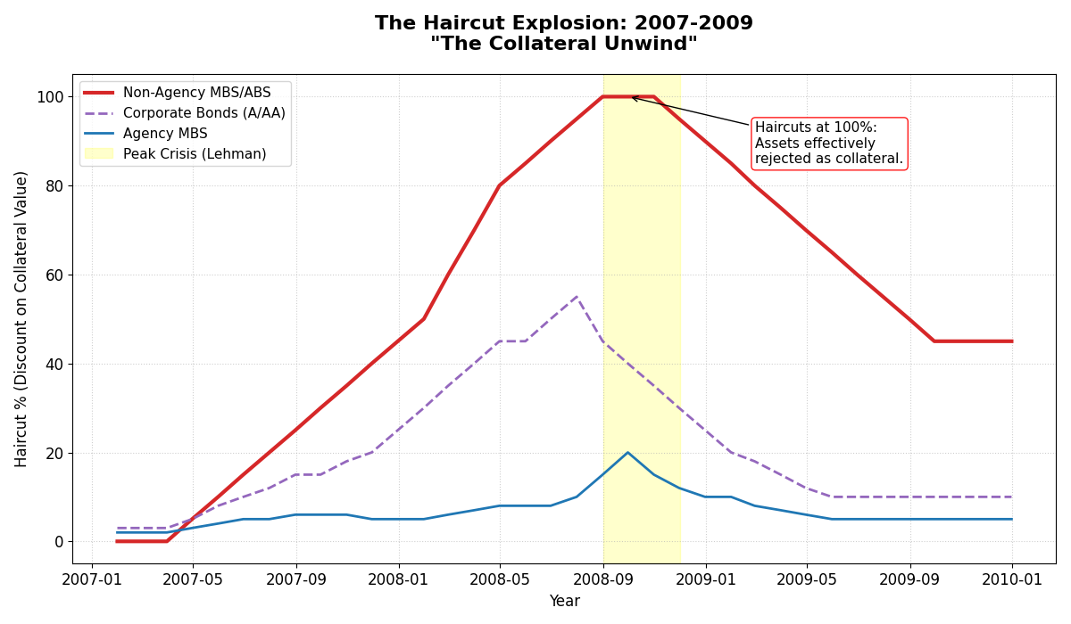 The data is stark. Before the 2008 crisis, haircuts on structured credit (including non-agency MBS and ABS) were near zero. When the crisis hit, those haircuts spiked by up to 90 percentage points in just two years. This is the collateral unwind in action—when trust evaporates, haircuts skyrocket, and the entire chain collapses.
