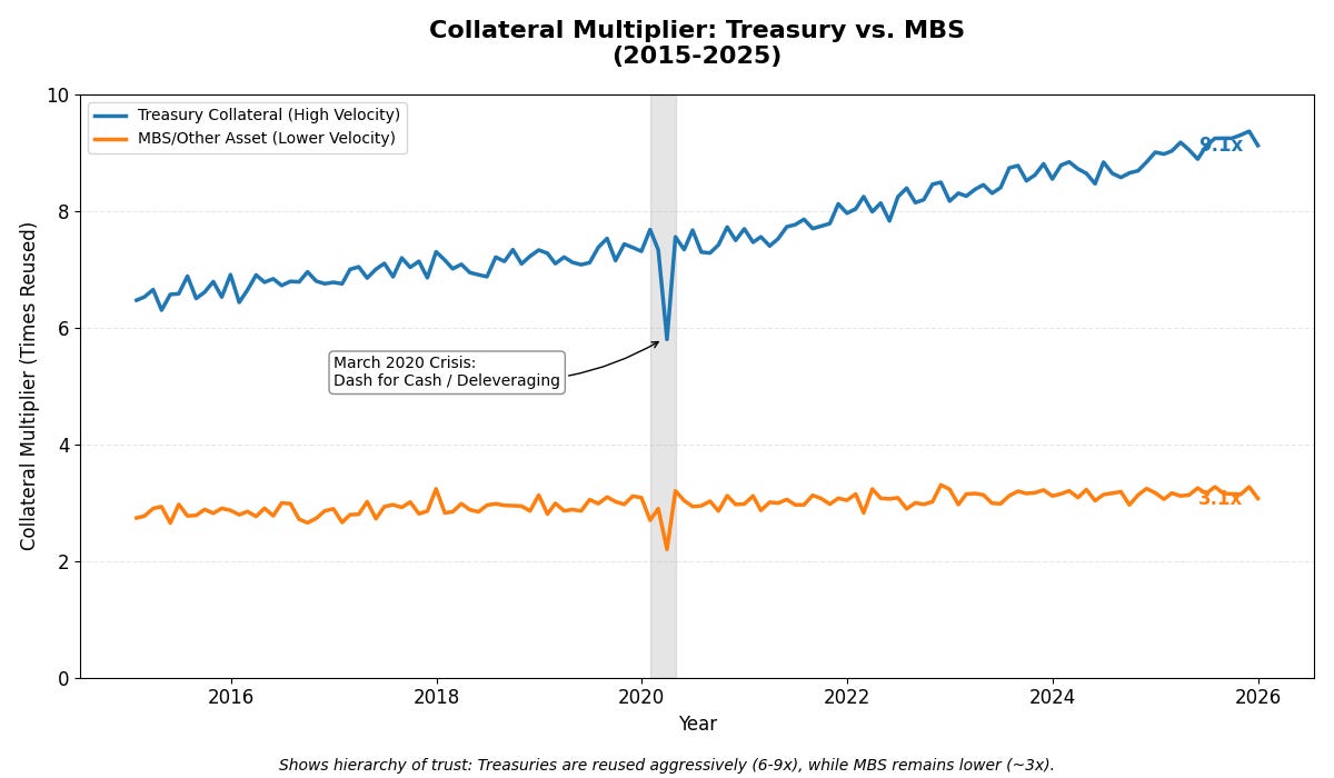 Once MBS achieved “safe asset” status, the rehypothecation machine kicked into high gear. Dealers could now take MBS as collateral, rehypothecate it, and use it to secure further borrowing—just like they did with Treasuries.