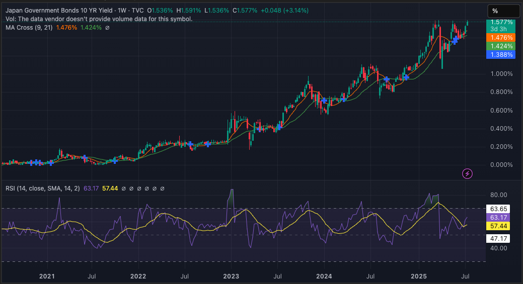 This represents a dramatic shift from the near-zero yield environment that characterized Japanese debt markets for decades. The 10-year yield, now at 1.60%, stands at its highest level since 2008. It’s the same chart.