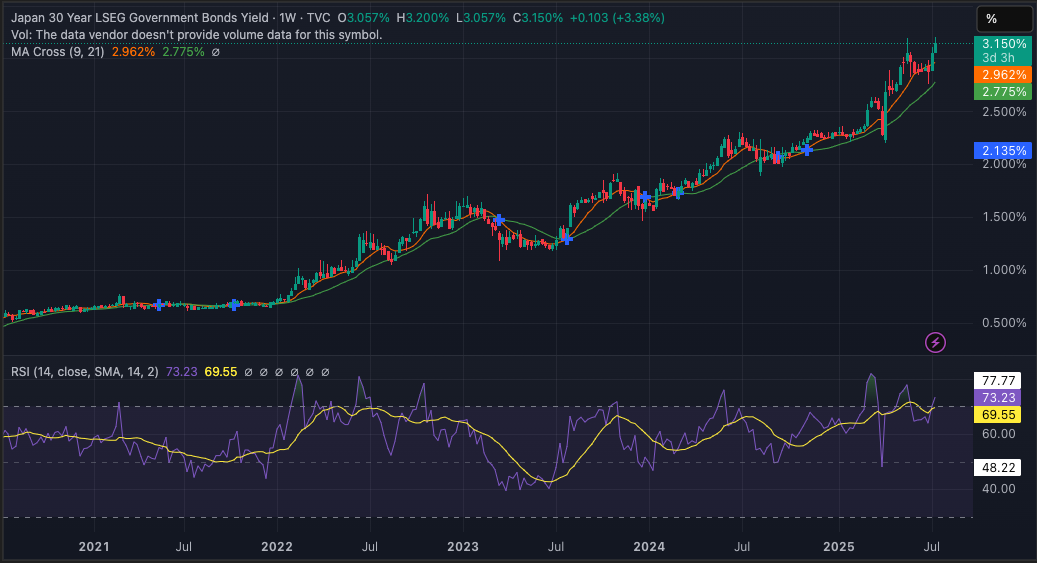 However, the bond yields did not relent, and the JP30Y shows a 6X increase in financing costs for the Japanese government in the last five years. See below.