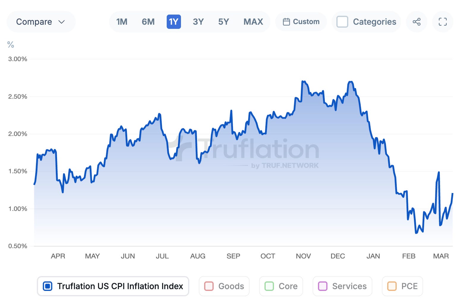 So far, despite rhetorical flourishes about using the money printer, the administration has not launched a new round of broad, unconditional cash transfers comparable to the pandemic response. The fiscal push has been more about tax incentives, regulatory shifts and sector‑specific support than about mailing cheques to every household. In an environment where capital remains mobile and world trade, though strained, still distributes production across multiple regions, that kind of targeted industrial policy is unlikely to recreate a 1970s‑style inflationary hotbox on its own. As such, despite rising oil prices, the Truflation index which captures more coincident indicators and leads CPI by 3 to 6 months is still at 1.21%. CPI also captures the coincident oil prices but given the lag of other indicators, like rent, used in CPI, I wouldn’t be surprised if the CPI number for March is rather low.