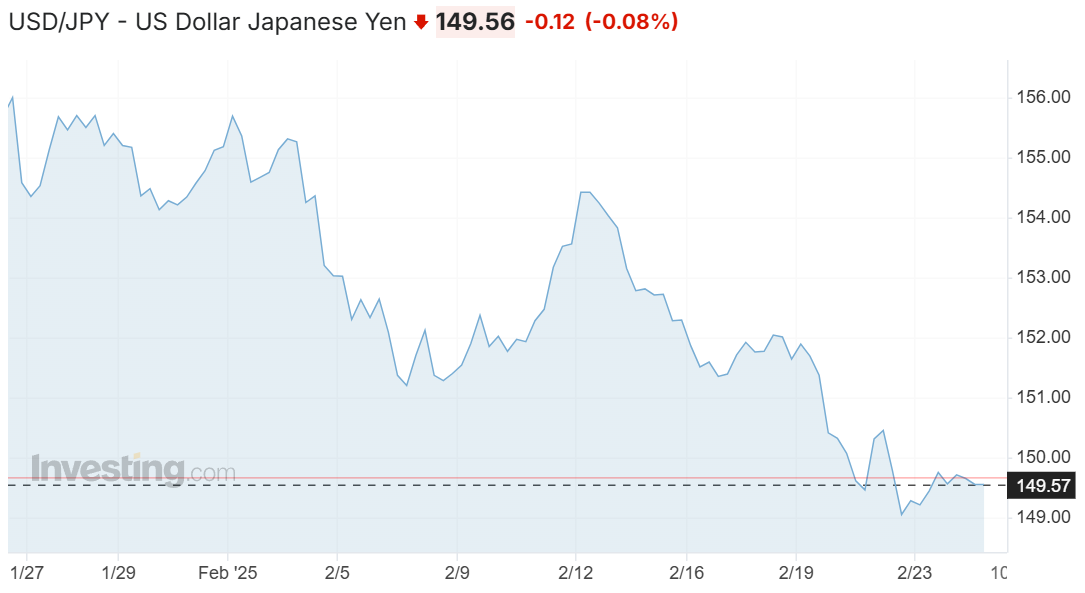 For me, one of the most significant undercurrents this week is the potential reversal of the Japanese yen carry trade, a strategy that has fueled speculative bets across global markets for decades. Historically, investors borrowed cheap yen—thanks to Japan’s ultra-low interest rates— to invest in higher-yielding assets like U.S. stocks, cryptocurrencies, and emerging market equities. With the Bank of Japan (BOJ) raising short-term rates to 0.5% in January and signaling further tightening, the yen has strengthened significantly, up 6% recently and nearing a six-week peak at 149.50 per dollar. Simultaneously, the 10-year JGB yield climbed to 1.44% (before coming down to 1.36%), its highest in 15 years, as the BOJ scaled back bond purchases to 4.5 trillion yen monthly, targeting 3 trillion by March 2026.