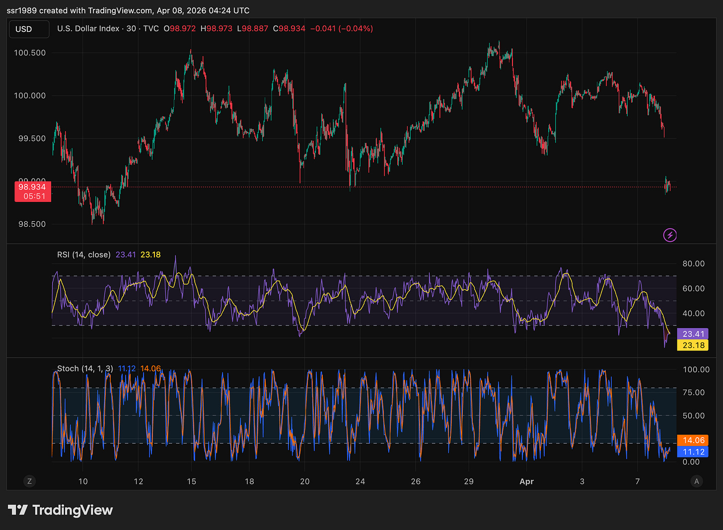 The dollar is technically oversold and could bounce. At RSI 23 on the 30-minute chart, the DXY is pricing in near-term exhaustion of sellers. A mean-reversion bounce to 99.30–99.60 would create a short-term headwind for wheat, temporarily masking the underlying bullish fundamentals. The directional trend matters more than the intraday reading, but levered wheat longs opened today could face mark-to-market pain before the thesis resolves.